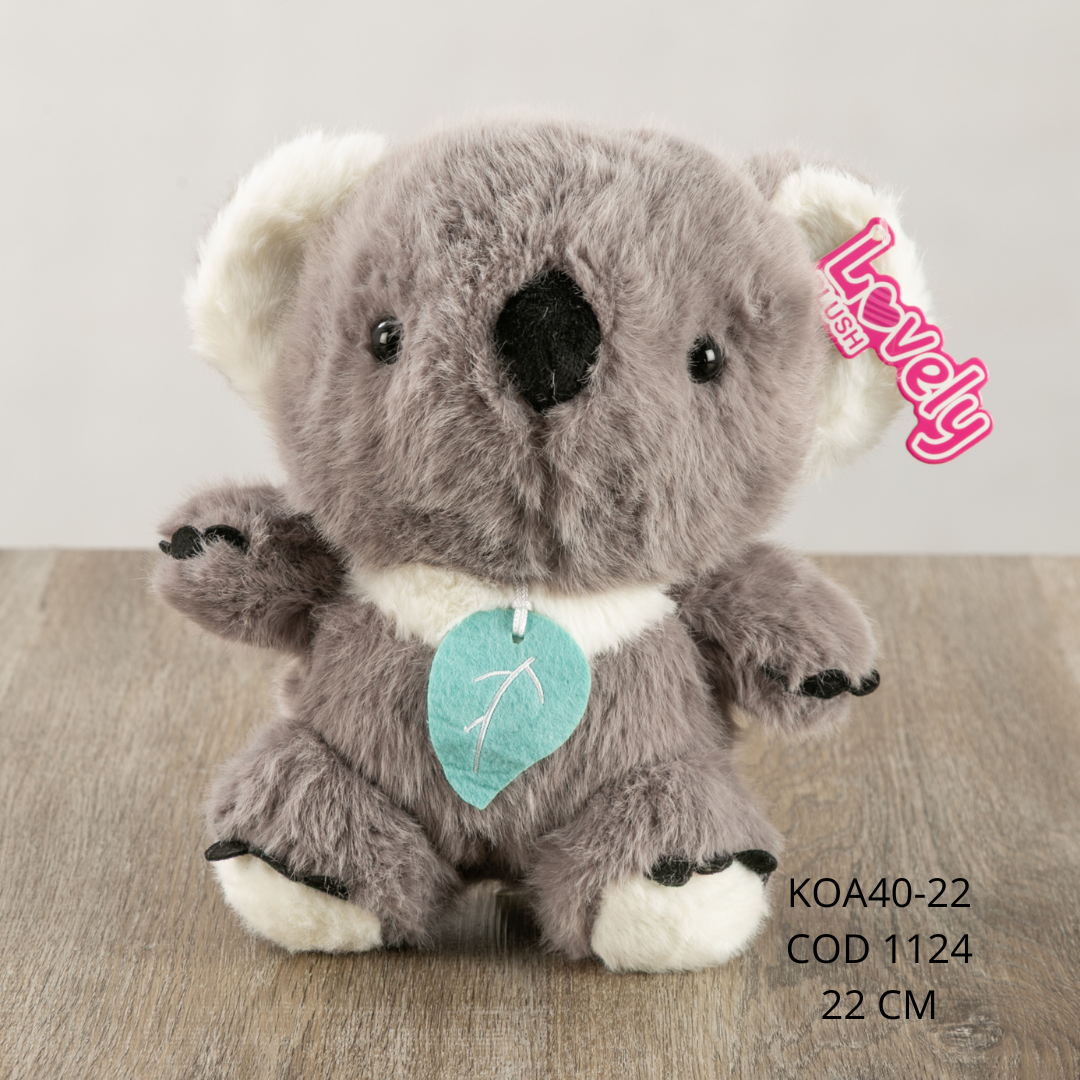 Peluche de koala con diseño tierno y expresión dulce. Presenta una textura suave y esponjosa, con formas redondeadas y detalles delicados que resaltan su apariencia encantadora y decorativa.