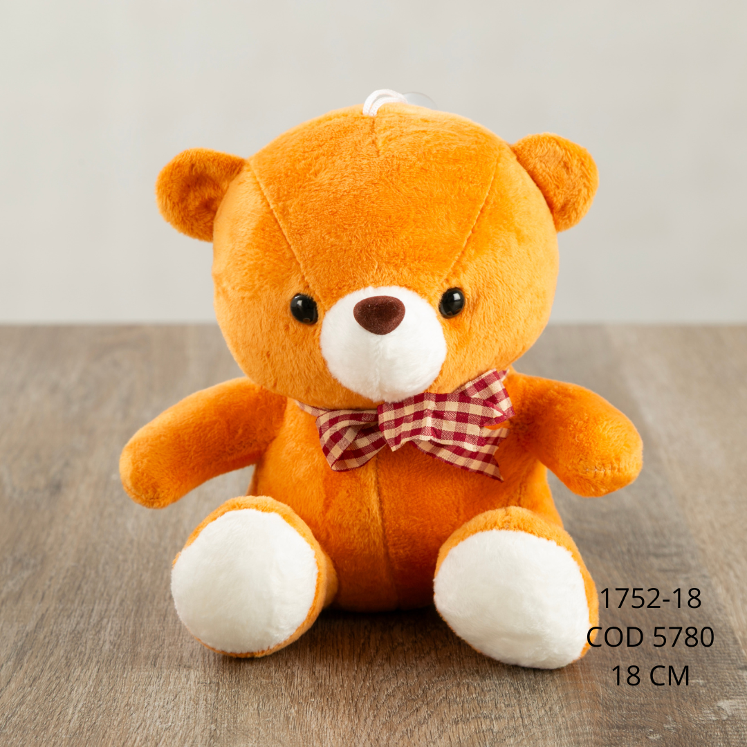Peluche de osito en tono naranja vibrante, con diseño clásico y expresión tierna. Presenta una textura suave y esponjosa, con detalles claros en el hocico y las patas que contrastan delicadamente con el color principal. Lleva un pequeño moño a cuadros en el cuello que añade un toque encantador y decorativo. Sus proporciones son equilibradas y su acabado transmite calidez y dulzura, ideal para lucir como elemento decorativo o de colección.