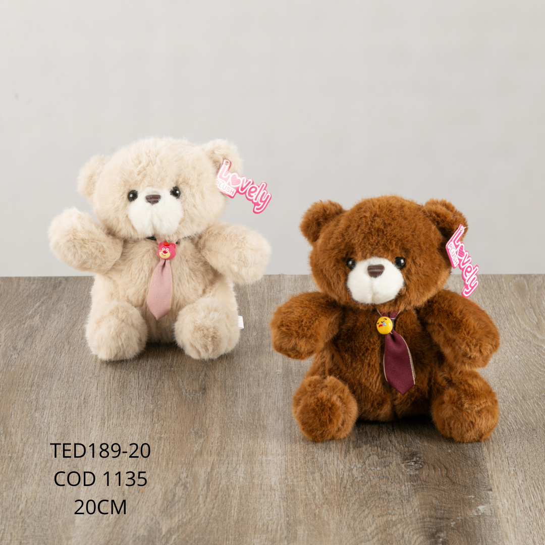 Osos sentados sobre sus dos patas, uno en color beige claro y otro en color café oscuro, ambos con una corbata como detalle en el cuello que complementa su diseño. Están confeccionados en materiales suaves y agradables al tacto, con una apariencia tierna y clásica que resalta su encanto.