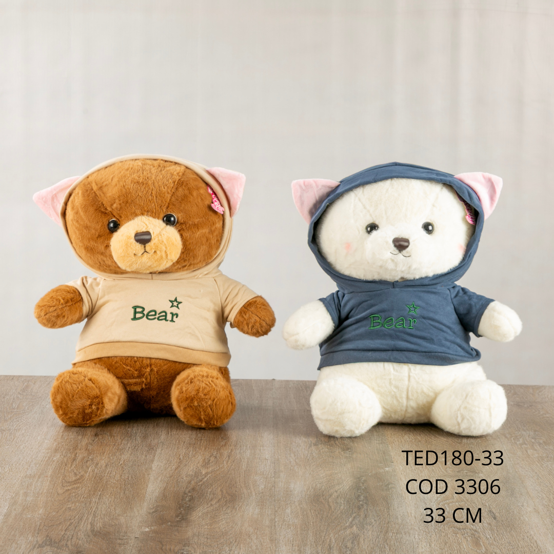 Peluches tipo gato en colores blanco y café; el peluche blanco lleva un saco tipo gato de color azul oscuro, mientras que el peluche café viste un saco tipo gato en color rosado. Están confeccionados en materiales suaves y agradables al tacto, con un diseño tierno y llamativo que resalta sus detalles y estilo encantador.