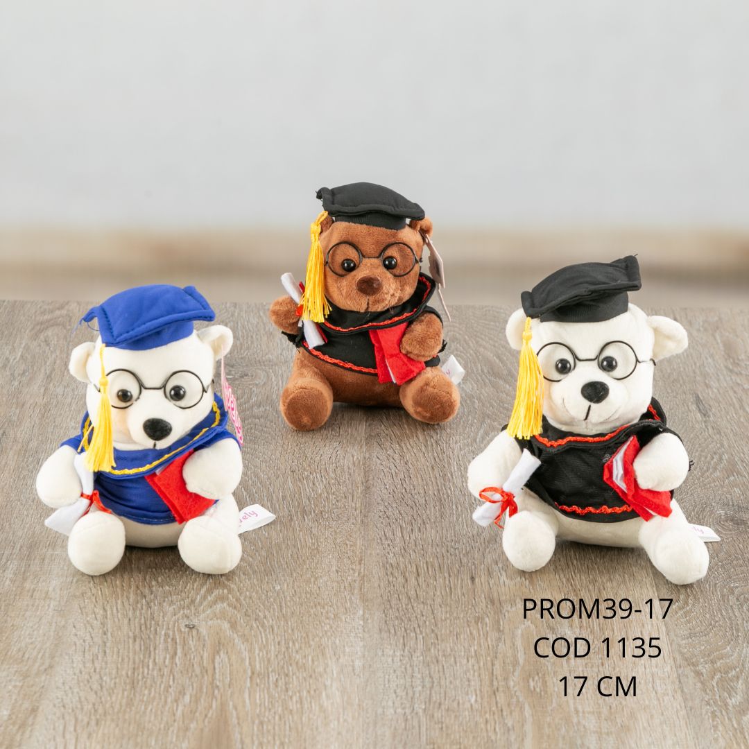 Oso de peluche afelpado confeccionado con felpa premium de textura suave y relleno esponjoso que mantiene su forma. Viste toga y birrete en tela de excelente calidad, con acabados precisos y detalles