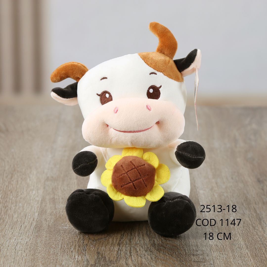 Hermoso peluche de Vaca con girasol afelpado de pelo corto. Excelente material y deliciosa fragancia. Tamaño de 18 centímetros.
